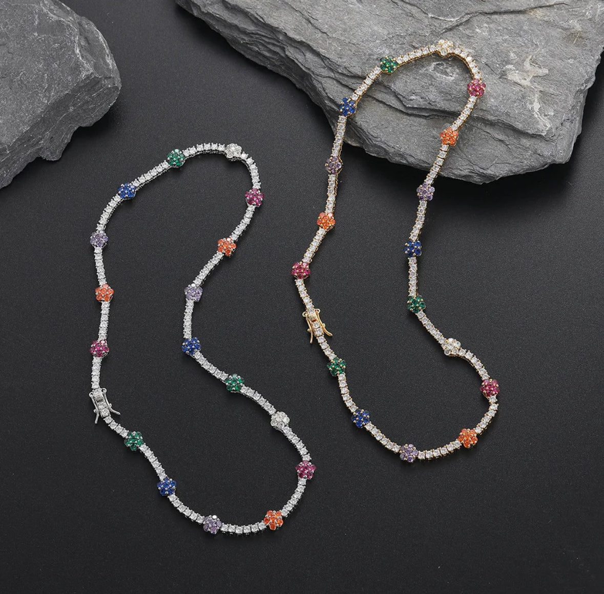 luxury colorful cz filled flower bomb 3mm tennis style necklace available in gold or silver