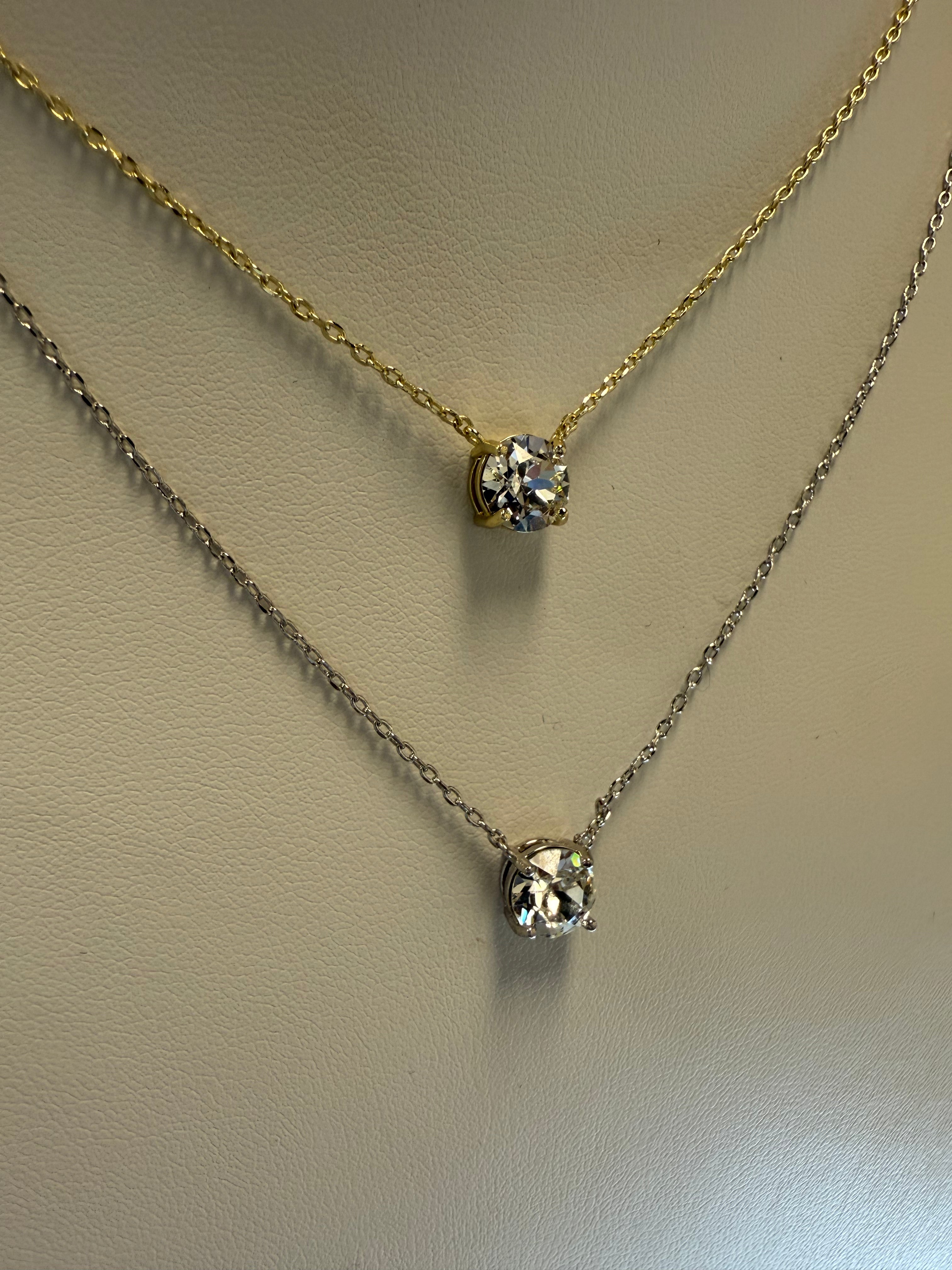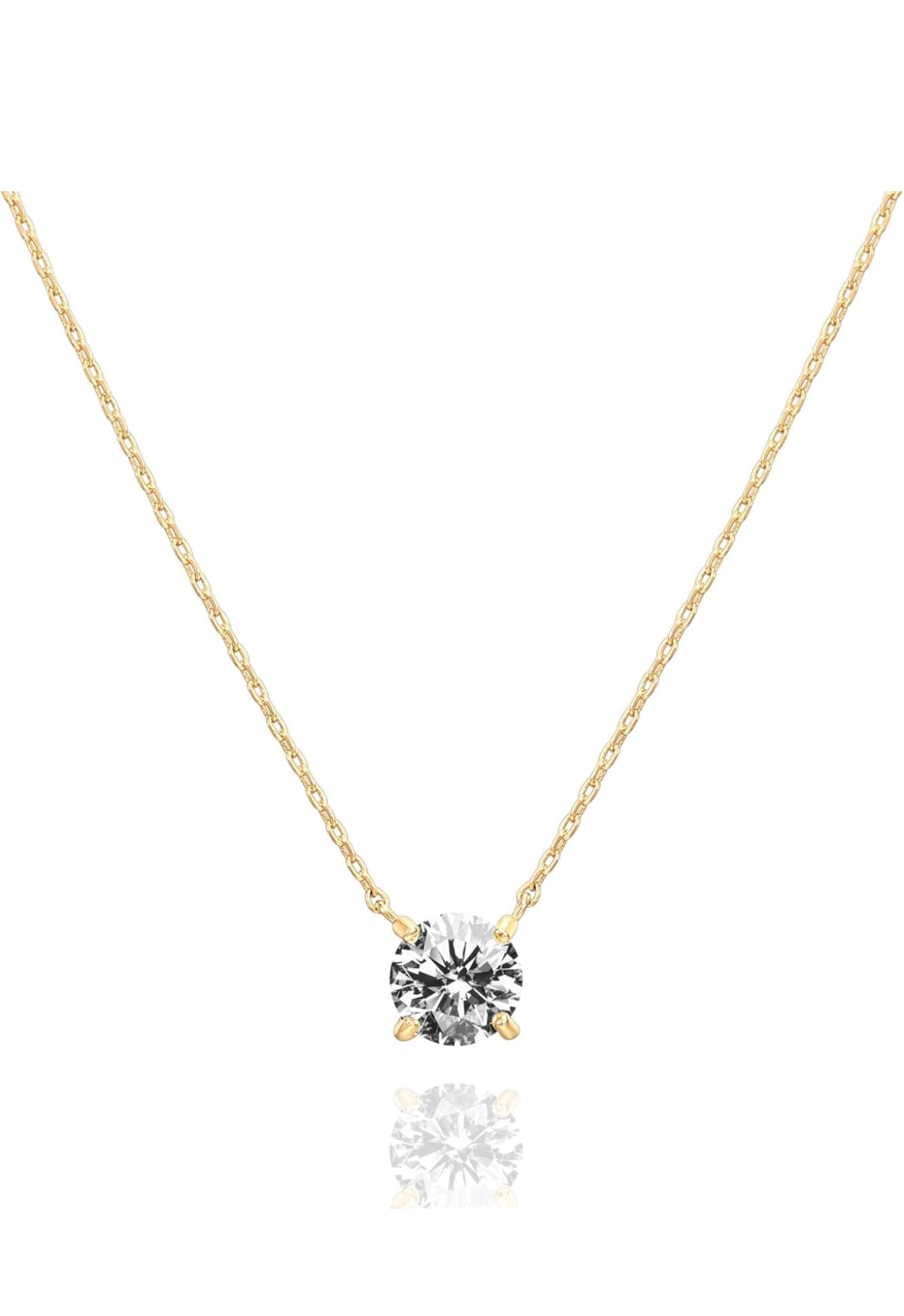 A 7.3mm Cubic Zirconia Crystal is prong set in a 14K yellow gold plated setting to complete this small pendant. At 18" in length with a 2" extender this yellow gold jewelry for women will comfortably fit all neck sizes gold plated metal