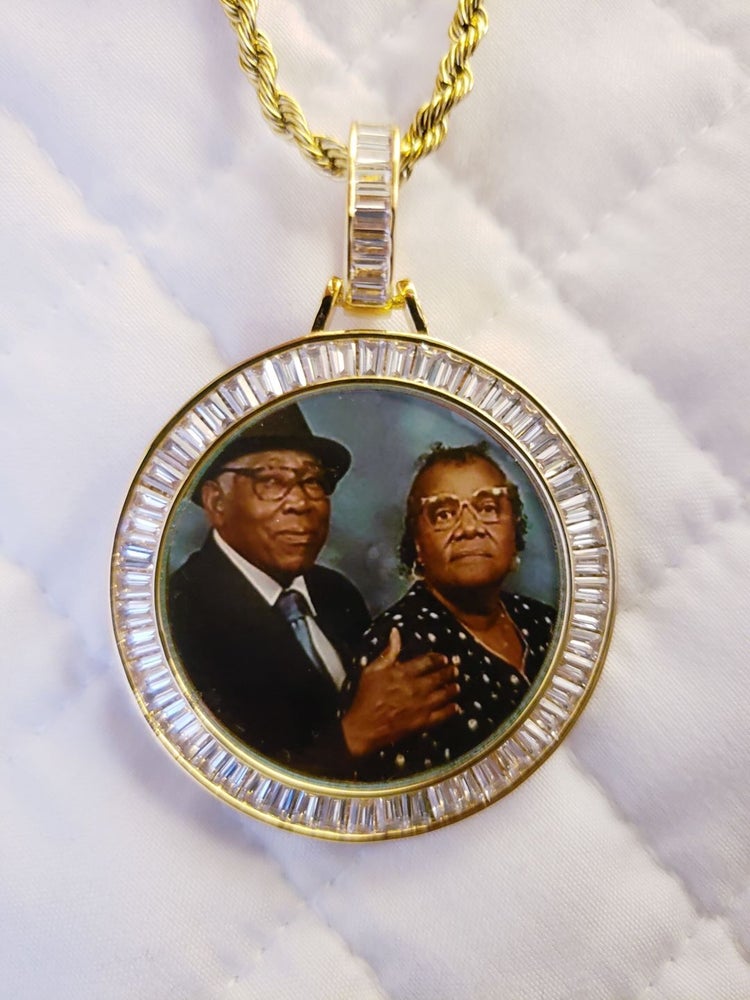 Gold or Silver plated custom picture pendant with beautiful cz begets outlining your custom picture this item is PREORDER ONLY processing time 2 weeks pictures must be sent prior to delivery all pendants come with stainless steel rope chain