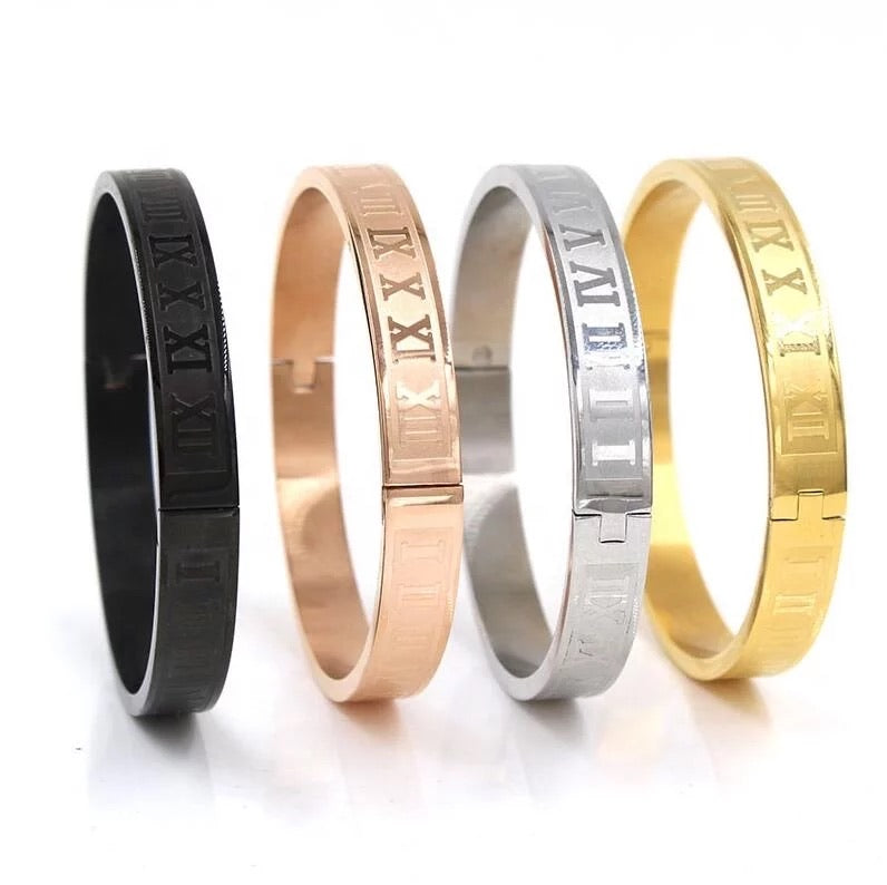 Unisex Roman Numeral Bangle Bracelet available in gold, silver, black and rose gold for Men and Women available in small and large