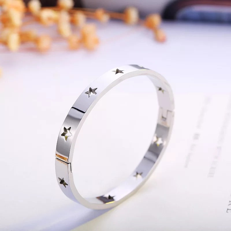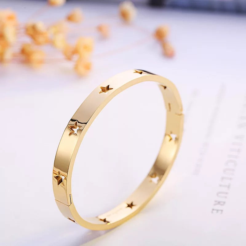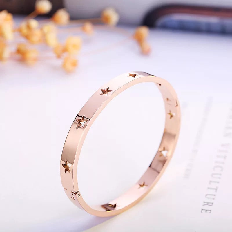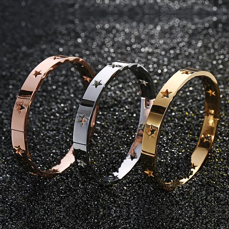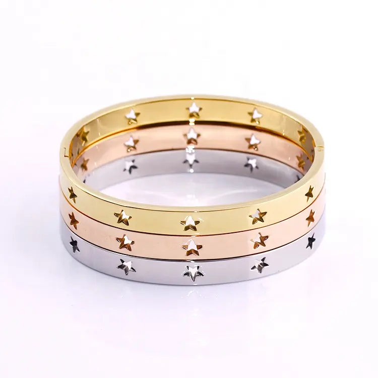 Gold, Silver or Rose Gold Plated bangle bracelets with cut out shaped stars all around